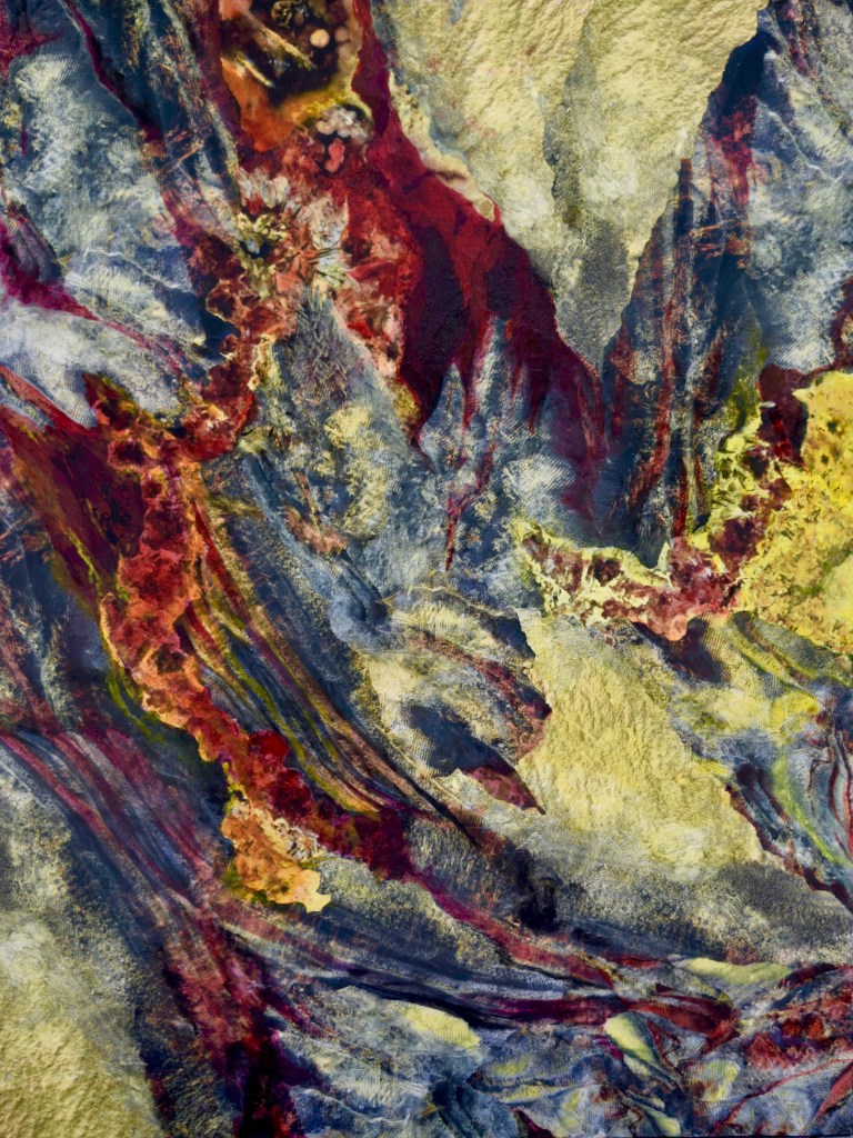 Told in rich earthy tones, Judith Rostenne’s Metamorphosis is a beautiful work on paper that recalls topography. There is something prehistoric about the comingling of the kaleidoscopic yet subdued hues. Try as I might, I cannot list its many colors, they bleed into each other and are too enigmatic for verbal description. Organic and other worldly, the thick applications of paint remind one of tectonic shifts and the earth’s slow yet inevitable metamorphosis. Every inch of the paper is covered in thick impasto and passages of color that defy description. Had Rostenne indulged in a brighter acrylic palette, the painting would overwhelm the viewer, but the subdued hues draw the viewer into their mysterious embrace instead of repelling them with an overly saturated assault of color.